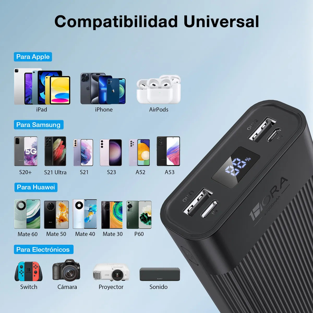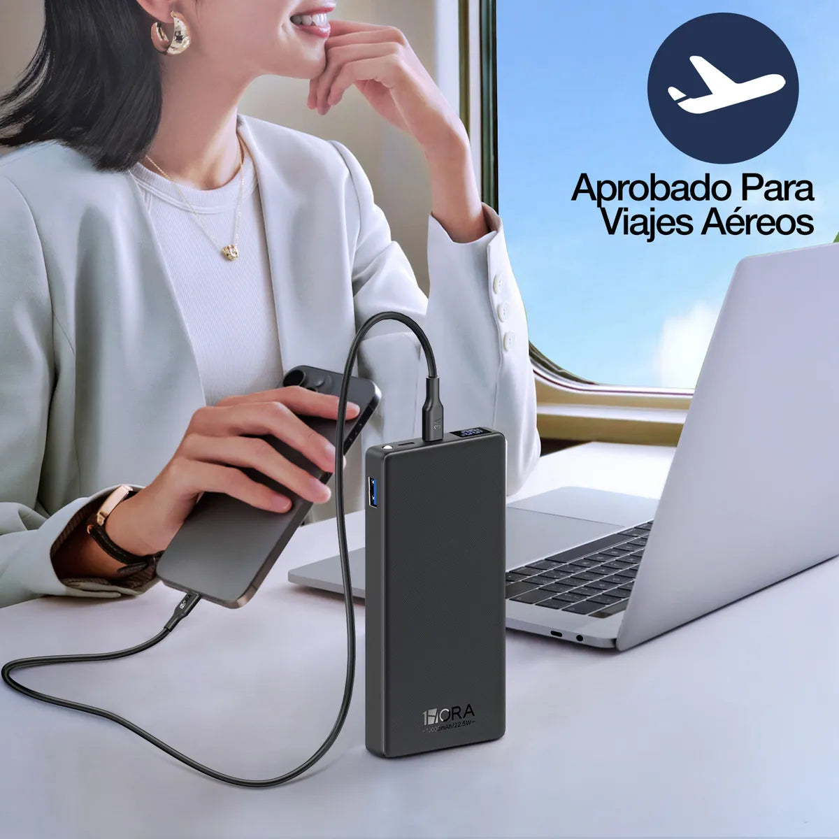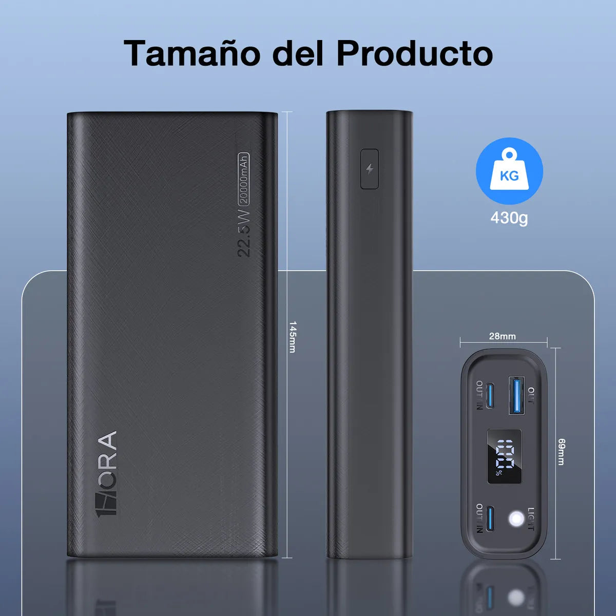 1Hora BaterÃa Portátil 20000mAh Carga Rápida 22.5W,Power Bank con cable USB C-C de 30cm,Tipo C Entrada y Salida 2 Puertos USB,Pantalla LED, linterna GAR158(PAQUETE DE 10PC )